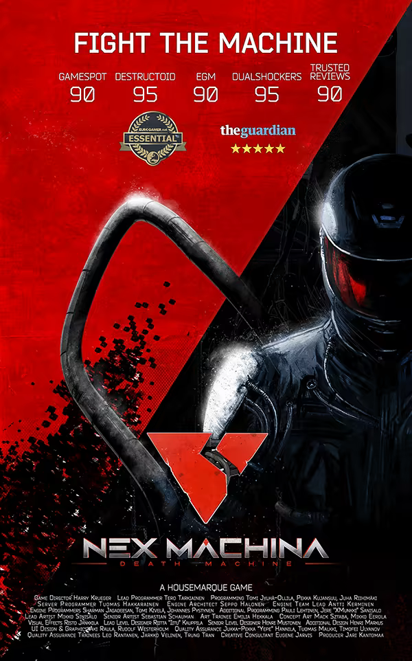 《Nex Machina》是Housemarque制作的强烈街机风格的双摇杆射击游戏。《Nex Machina》从《Robotron》和《Smash TV》获得灵感,主要故事背景是遥远的机械科幻(cablepunk)主题未来,并主打纯粹的动作打斗、体素破坏以及玩家竞争。