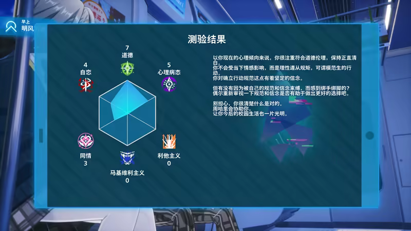 根据游戏内的诊断与选项,上述六种人格参数将会发生变化。